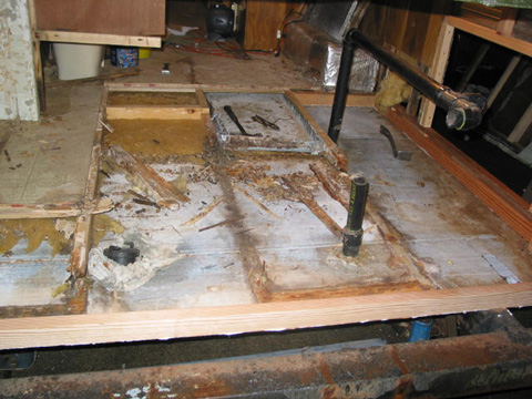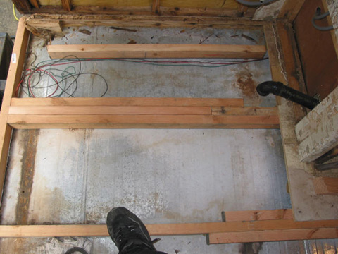 Bathroom floor framework: All the structural members are now replaced. The bathroom floor is solid again. Note the heat ducts have been re-installed as well.