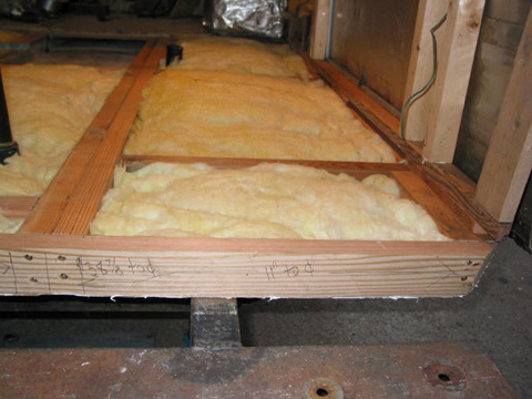 Insulated bathroom floor: If I'm going to add insulation, may as well do it right and fill the joist cavity. Ready for plywood now.