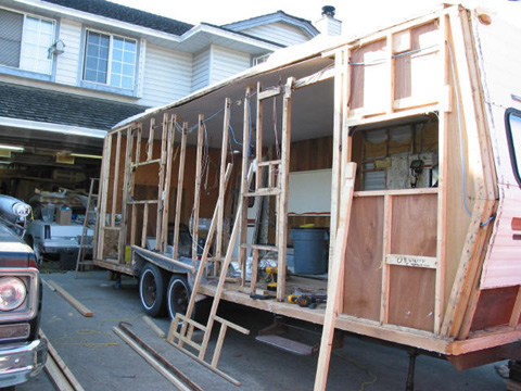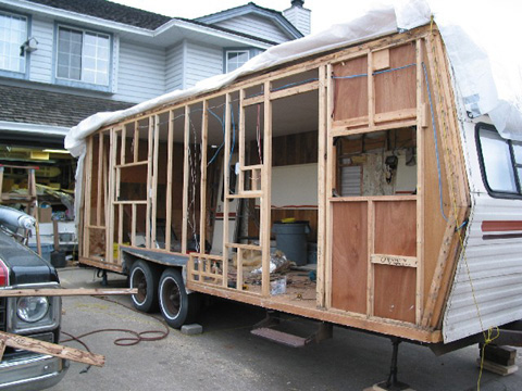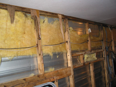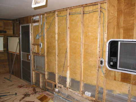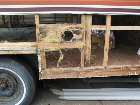 | This page I wrote for my old rv website RVforSaleGuide.com before developing the Vanabode as the best travel vehicle for cheap easy long term road trips. People still like big rv's despite the much greater cost and trouble to operate, so here's what I know about them. Travel Trailer Water Damage page 6RV trailer repair floor water damage, roof leaks, wall damage Wall beside door: This one didn't look too healthy from the outside. Doesn't look very promising from the inside, either.