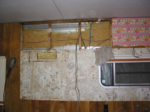 Front corner - kitchen side: This window leaked the worst, as evident in the paneling. Sure wish I could find some panels to match. Above kitchen: The top panels are rotted out. Studs seem OK.