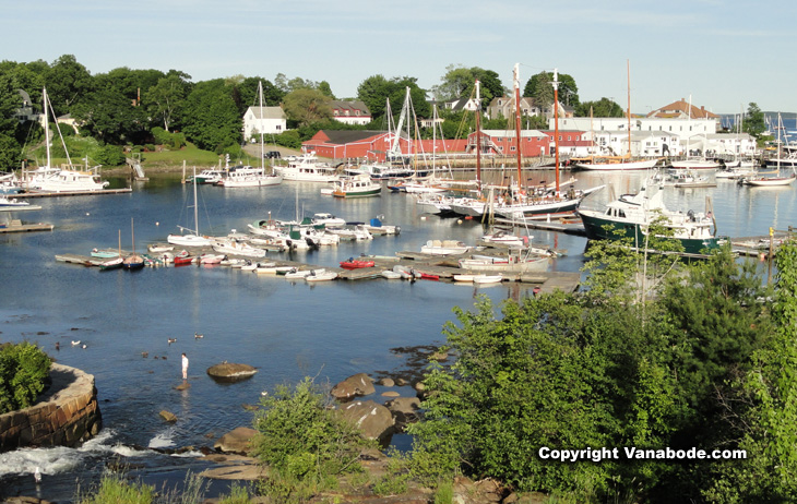 Above: Picture of our view while eating on the roof deck at Camden Deli. You can see Camden Falls flowing into the Megunticook River and the Atlantic Ocean past the boats in the marina. See the boy on the rocks below. Our vantage point is from the restaurant balcony.