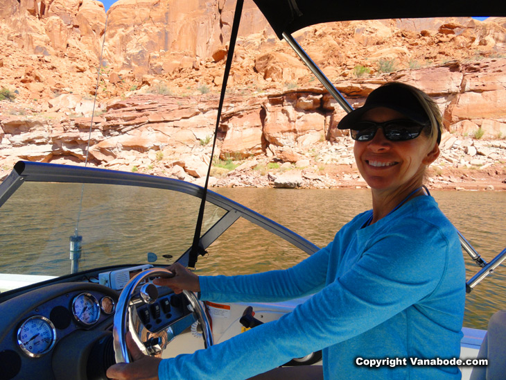 Above: Kelly captains the power boat through orange canyons, over clear waters, under blue skies, through Lake Powell.