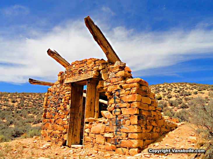 Above: Ghost towns abound just off the highways and smaller roads all over Nevada and the west. Here, on the way from Winnemucca to Austin we visit a crumbling miners shack hand made from local stones and clay motar.